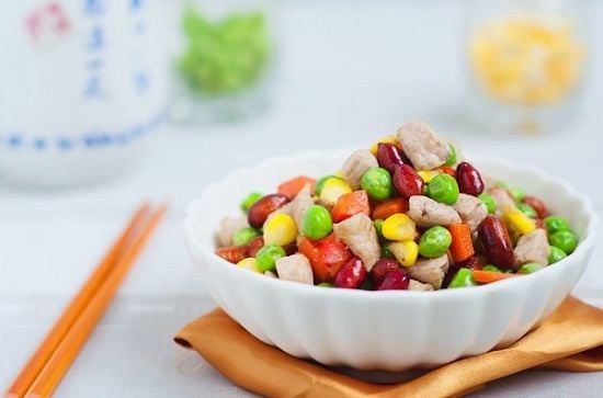 – Xào hỗn hợp đậu, ngô và cà rốt khoảng 2-3 phút thì bạn cho thịt heo vào. Bạn nhớ đảo đều tay và liên tục nhé.